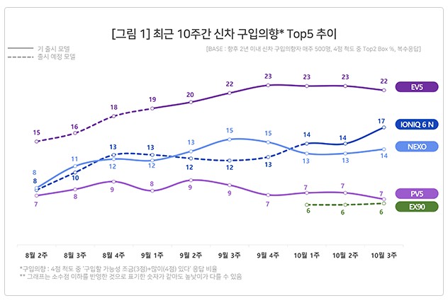 EV5는 출시 전인 7월 2주 조사에서 13%로 출발해 9월 출시 직후 20%를 넘어섰다. 이후 최고치 23%를 기록한 뒤 소폭 조정을 거쳤지만, 여전히 경쟁 모델 대비 약 5%포인트 이상 높은 수치를 유지하고 있다. 이는 출시 직후 일시적 반짝 상승이 아닌, 일정한 소비자 호응이 지속되고 있음을 의미한다.