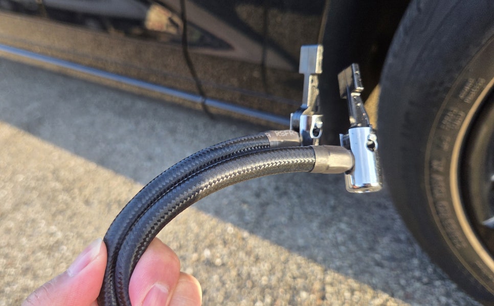 공기압 주입기 사용 방법은 매우 간단합니다. 60cm 양방향 에어호스를 공기압 주입기 후면에 하나 연결해 주고 나머지 한쪽은 타이어에 연결해 주시면 되겠습니다. 원터치 결합 방식으로 한 손으로도 편하게 장착할 수 있어 누구나 쉽게 공기압 주입기를 사용하실 수 있습니다. 반대로 뺄 때는 검정핀 부분을 다시 펴고 당겨만 주시면 쉽게 빠지게 됩니다.