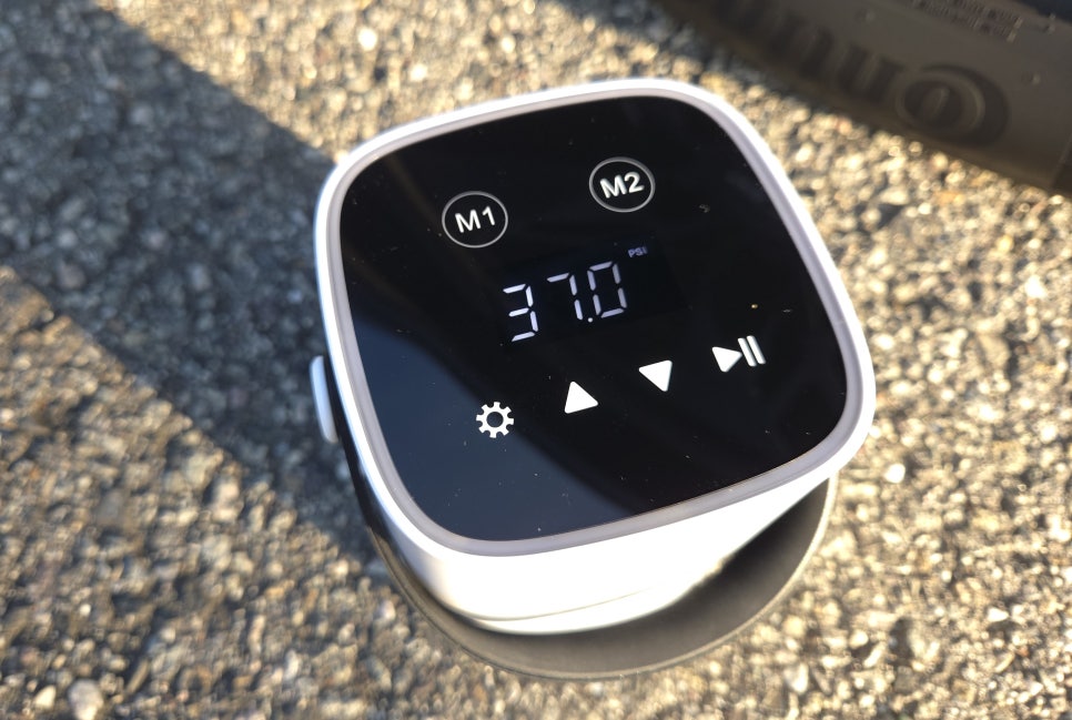 벤딕트 타이어 공기압 주입기는 오른쪽 설정 버튼을 통해 PSI, BAR, KPA, Kg/cm² 4가지 단위를 지원하고 있는데 저희는 PSI 단위로 놓고 사용하면 될 것 같아요. PSI 단위에 놓고 화살표를 움직이면 0.5 단위로 올리고 내릴 수 있습니다. 가장 위에 M1, M2 버튼은 차량 유형에 최적화된 값으로 설정해 주죠. 오른쪽 끝 재생/정지는 공기 투입/정지라 보면 됩니다.