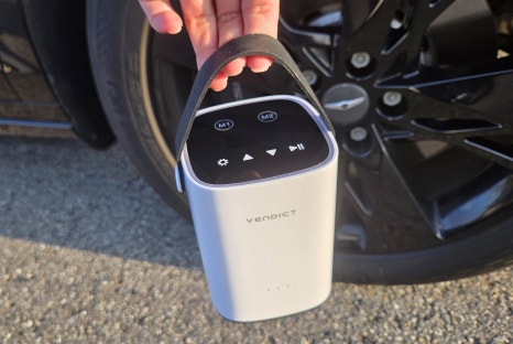 벤딕트 타이어 공기압 주입기는 98 x 98 x 133mm 컴팩트한 크기에 약 750g 가벼운 무게로 높은 휴대성을 지니고 있습니다. 상단에 LED 표시창과 터치 방식을 지원하고 하단에는 큰 팬과 함께 발열 문제를 90% 개선해 발열에 대한 걱정은 안 하셔도 됩니다. 그리고 전면에는 배터리 잔량을 알 수 있는 인디케이터와 뒤쪽에는 전원 버튼 및 단자/포트가 위치하고 있네요.