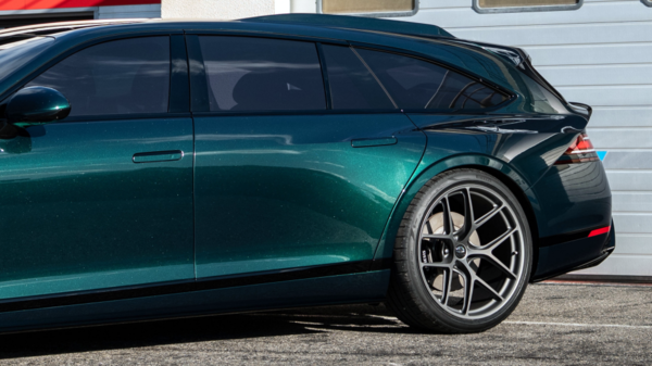 G90 윙백의 디자인은 기본적으로 G90의 고급스러움을 유지하면서, 스포츠 왜건의 감성을 적극적으로 녹여냈습니다. 앞부분에는 더 얇아진 크레스트 그릴과 대형 에어 인테이크가 적용돼 마그마 디비전 특유의 공격적인 디테일이 강조됩니다. 전면 펜더는 넓게 벌어져 있으며, 그 아래에는 대구경 퍼포먼스 휠과 하이그립 타이어가 장착됐습니다. 측면은 길고 낮게 뻗은 루프라인이 핵심으로, 이 부분이 바로 세단에서 왜건으로 변모한 가장 큰 포인트입니다.