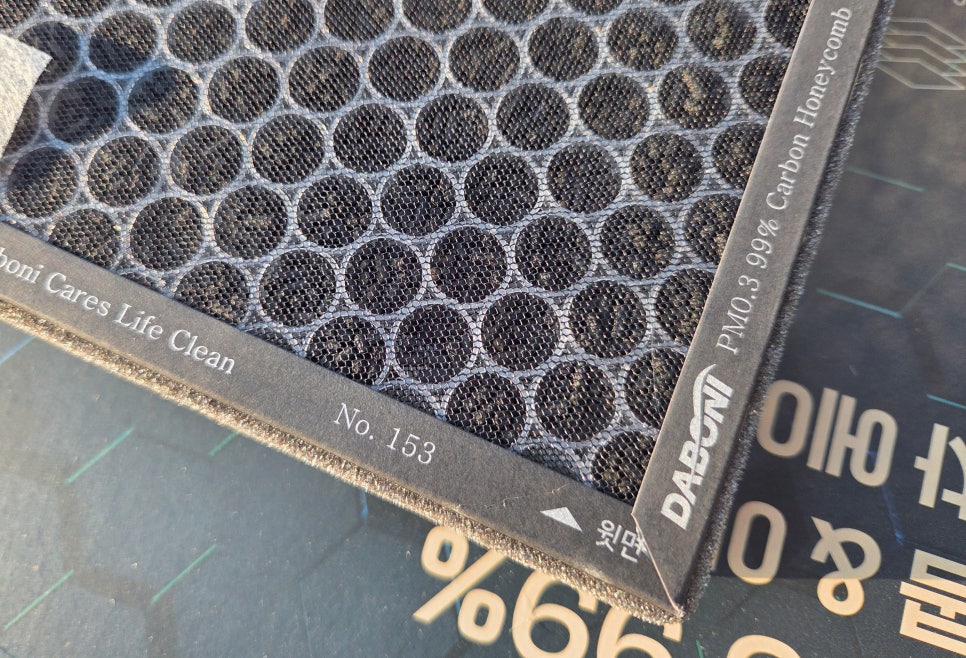 다보니 허니컴 필터 상단에는 활성탄 알갱이들이 촘촘하게 자리하고 있는데요 가루 타입이 아닌 알갱이 타입으로 되어 있습니다 허니컴 필터는 흡착률이 높은 첨착 야자 활성탄을 사용해 각종 냄새와 유해가스를 차단해 주죠. 그리고 후면부에는 멜트블로운 필터가 적용되는데 미세먼지 차단은 물론 PM0.3 필터를 적용해 MPPS 최대 99.9% 차단 효과를 갖고 있습니다.