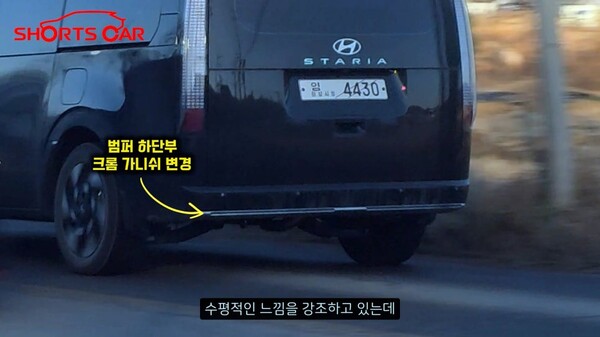 범퍼 하단의 프론트 립 장식은 크롬에서 반광 처리된 두꺼운 라인으로 변경되어 무게 중심이 낮아 보이는 효과를 만듭니다. 이러한 요소는 단순히 장식이 아닌, 스타리아의 웅장한 차체를 더 단정하게 정리해주는 역할을 합니다.