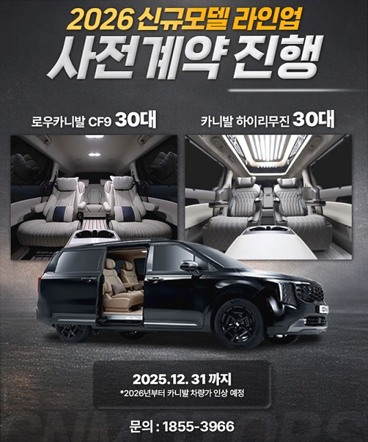 CN모터스는 고객들을 위해 2026년 신년 맞이 신규 라인업을 공개했는데요. 로우 카니발 CF9 출시와 함께 3번 패키지 출시입니다. 특히 CF9 30대, 카니발 하이리무진 30대 한정 수량으로 사전 계약 진행 중입니다. 구성 선택이 힘들었던 분들을 위해 각 열에는 시트와 플로어를 미이 반영해 선택에 보다 편리함을 더했고 25년 말까지 계약을 진행할 경우 현재 가격을 그대로 구매 가능하다고 합니다. 카니발 하이리무진 출고에 관심 있던 분들은 이번 기회에 빠르게 선점해 보시길 바랍니다.
