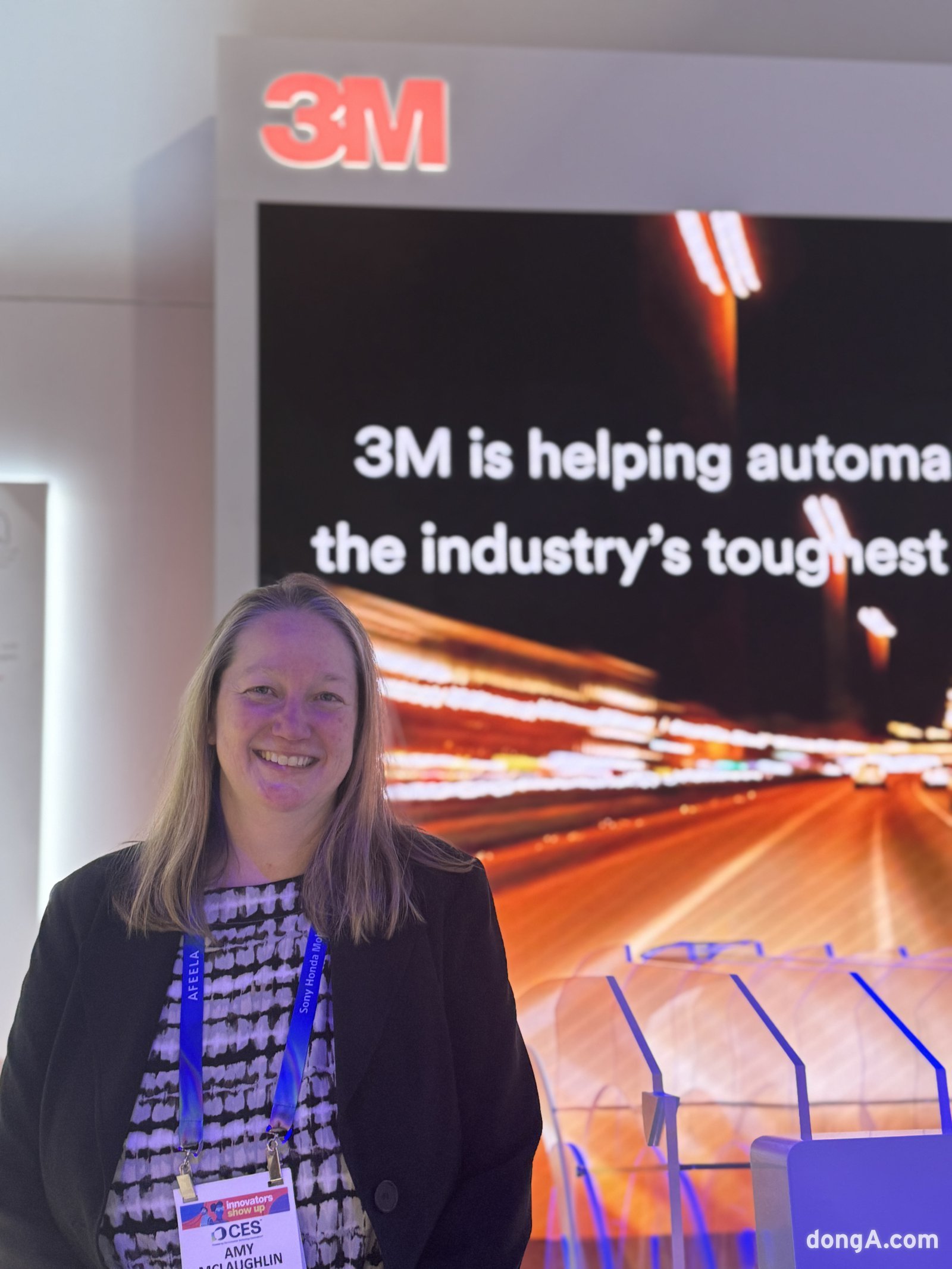 에이미 맥러플린 3M 첨단 소재 및 모빌리티 제품 플랫폼 총괄 사장이 6일(현지시간) CES가 열린 미국 라스베이거스 컨벤션센터 3M 부스에서 본보와 인터뷰를 진행하고 있다. 정진수 기자 에이미 맥러플린 3M 첨단 소재 및 모빌리티 제품 플랫폼 총괄 사장이 6일(현지시간) CES가 열린 미국 라스베이거스 컨벤션센터 3M 부스에서 본보와 인터뷰를 진행하고 있다. 정진수 기자