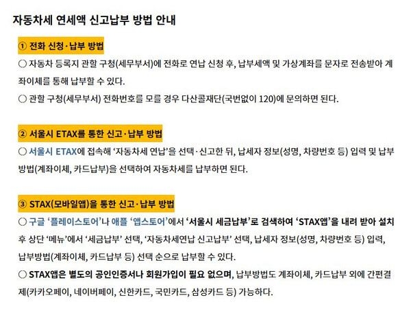 즉, 연납은 '미리 낸 만큼 끝까지 보유해야 하는 제도'가 아니라, 보유 기간에 맞춰 정산되는 구조입니다. 환급 신청은 온라인으로도 가능해 접근성 역시 높아졌습니다. 서울시 ETAX 누리집이나 STAX 모바일 앱을 통해 '자동차세 연납 환급 신청' 메뉴에 접속하면 절차를 진행할 수 있으며, 모바일 사용이 어려운 경우에는 관할 구청에 전화 또는 방문 신청도 가능합니다.