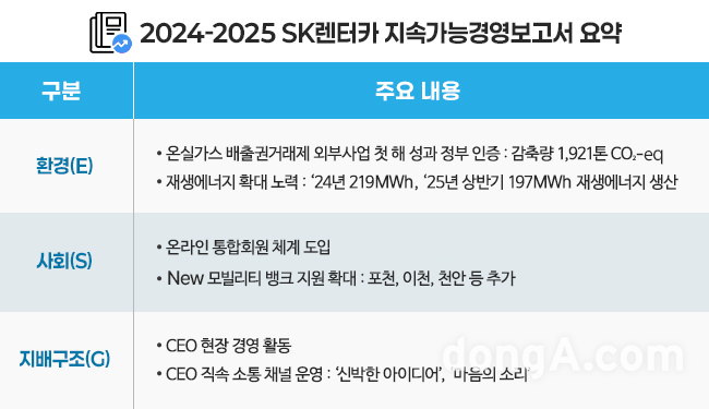 SK렌터카는 김필수 대림대 교수, 이호근 대덕대 교수, 오종석 국립공주대 교수 등 모빌리티 업계 전문가 의견을 반영해 회사의 사업과 이해관계자에게 영향이 큰 핵심 ESG 이슈를 도출했다. 그 결과 ▲온실가스 배출량 관리 및 저감 ▲고객 중심 경영 ▲지배구조의 투명성·전문성·다양성 등이 3대 핵심 이슈로 선정됐다. 환경 부문에서 SK렌터카는 실질적인 탄소 감축 성과를 냈다. 온실가스 배출권거래제 외부사업의 첫 해에 1,921톤 CO₂-eq의 감축량에 대해 정부로부터 공식 인증을 받았다. 재생에너지 확대에도 힘을 써 2024년 219MWh, 2025년 상반기 197MWh의 재생에너지를 생산하기도 했다.