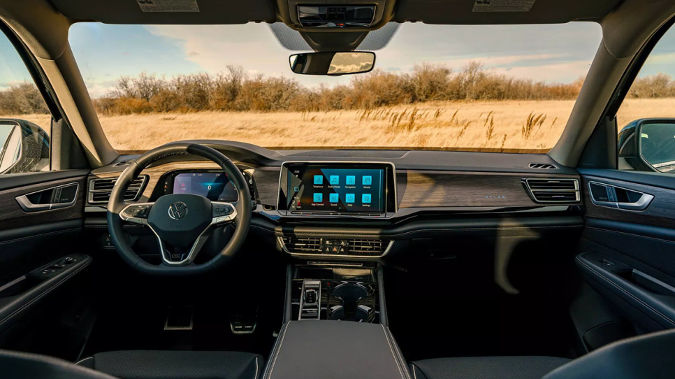폭스바겐 아틀라스 내부는 고급스러운 모습이 돋보이죠. R-Line 트림답게 3-스포크 D컷 스티어링 휠을 적용해 스포티한 모습도 살짝 겸비하고 있습니다 그리고 10.25인치 디지털 콕핏과 12인치 인포테인먼트 시스템은 직관적인 차량 정보를 제공하죠. 도어 패널과 센터패시아 등 부분적으로 우드 트림을 적용해 고급스러운 분위기까지 잘 갖추고 있죠.