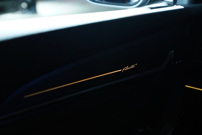 밤이 되면 필랑트의 실내는 더욱 화려해집니다. 라인을 따라 흐르는 앰비언트 라이트가 고급스러운데, 특히 조수석 쪽에 새겨진 'FILANTE' 텍스트가 빛나는 디테일이 정말 예쁩니다.