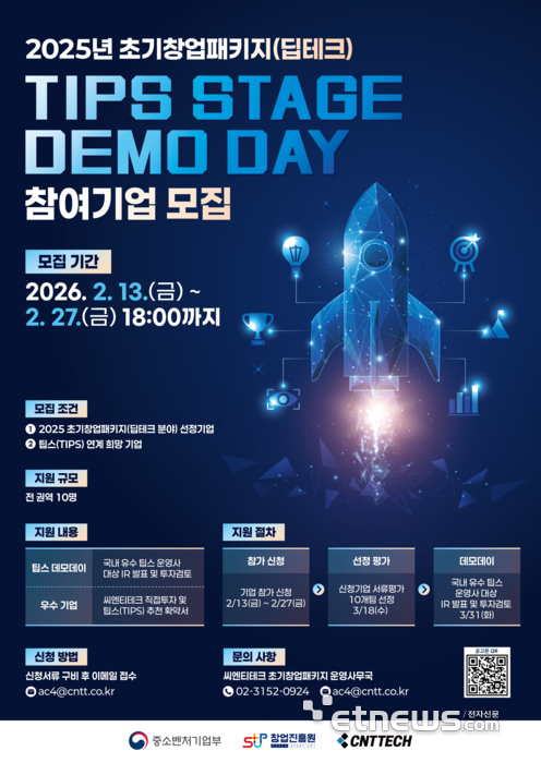 투자 전문 액셀러레이터 씨엔티테크(대표 전화성)가 '2025 초기창업패키지 TIPS 스테이지 데모데이' 프로그램 참가기업 모집을 시작한다고 13일 밝혔다.