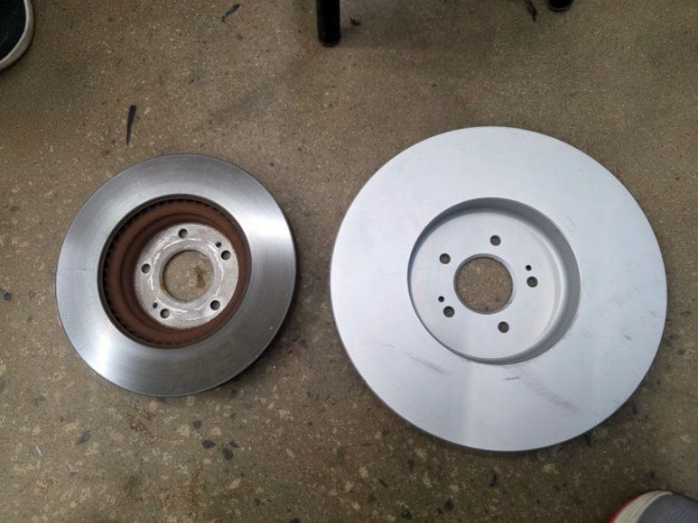 좌측이 순정 디스크이며 우측이 380mm 디스크입니다.