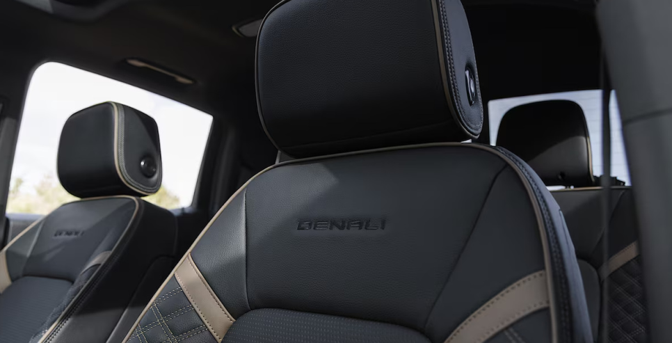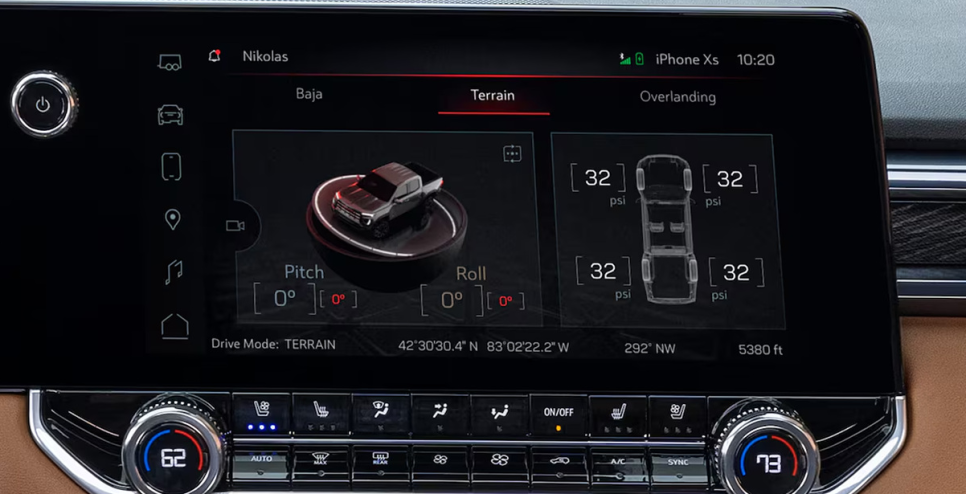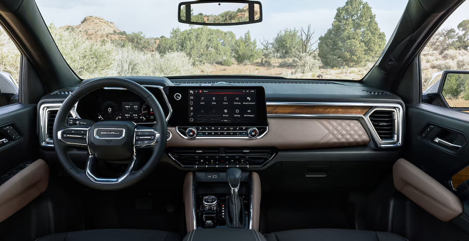 GMC 캐니언의 실내 디자인은 기능성과 편의성의 균형을 중심으로 설계됐는데요. 11인치 디지털 계기판과 11.3인치 센터 디스플레이, 6.3인치 HUD가 기본으로 구성되어 있습니다. 기본적인 공조 버튼 등 물리 버튼들을 많이 활용해 직관적인 조작감을 제공하죠. 실내 소재 마감은 젯 블랙, 티크 포인트 천공 가죽 시트와 레이저 각인 오픈 포어 우드 트림이 고급스러움을 높이고 있습니다.