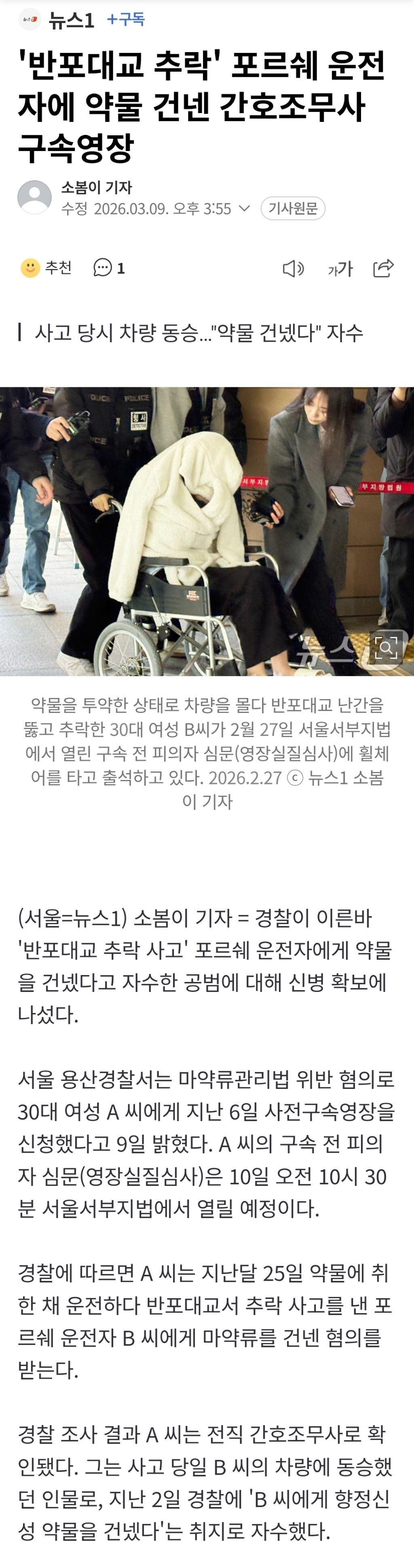 '반포대교 추락' 포르쉐 운전자에 약물 건넨 간호조무사 구속영장 경찰이 이른바 '반포대교 추락 사고' 포르쉐 운전자에게 약물을 건넸다고 자수한 공범에 대해 신병 확보에 나섰다. 서울 용산경찰서는 마약류관리법 위반 혐의로 30대 여성 A 씨에게 지난 6일 사 n.news.naver.com 🌾🌾하고 일교차있는 내일 날씨 예보어른들을 위한 요즘 건전지 포장직장동료가 된 28년전 아이없는게 없는 무도일본 소아과 특징