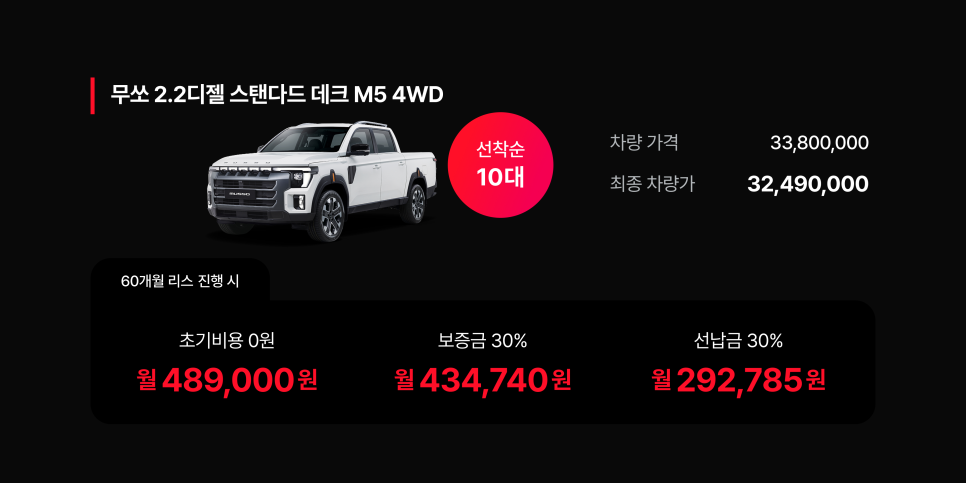 무쏘 디젤 2.2 모델은 시작가 31,700,000원을 바탕으로 픽업트럭 본연의 기능적 가치에 집중한 실용주의적 포지셔닝을 취하고 있다. 특히 리스 프로그램을 활용할 경우 월 489,000원(초기비용 0원 기준)이라는 공격적인 금융 솔루션을 제시함으로써 상업적 이용자들의 진입 장벽을 획기적으로 낮춘 점이 고무적이다. 이는 타스만 익스트림 트림의 리스료인 696,200원과 비교했을 때 운영 효율성 측면에서 압도적인 우위를 점하는 지표이다.