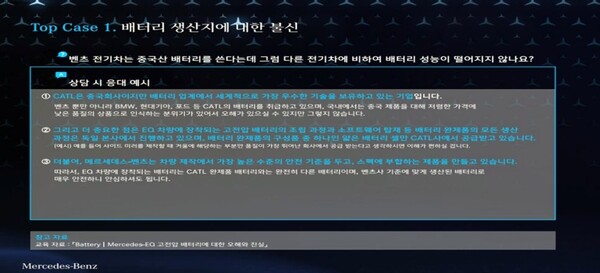 하지만 공정위 조사 결과, 이 차량에는 중국 배터리 제조사 파라시스(Farasis)의 배터리 셀이 탑재됐음에도 판매 지침에는 해당 내용이 명시되지 않았습니다. 특히 벤츠는 판매 지침에서 세계 배터리 점유율 1위 기업인 CATL 배터리의 기술력과 장점을 강조하는 내용을 포함했고, 딜러들에게도 소비자 질의가 있을 경우 CATL 배터리를 중심으로 설명하도록 안내한 것으로 드러났습니다.