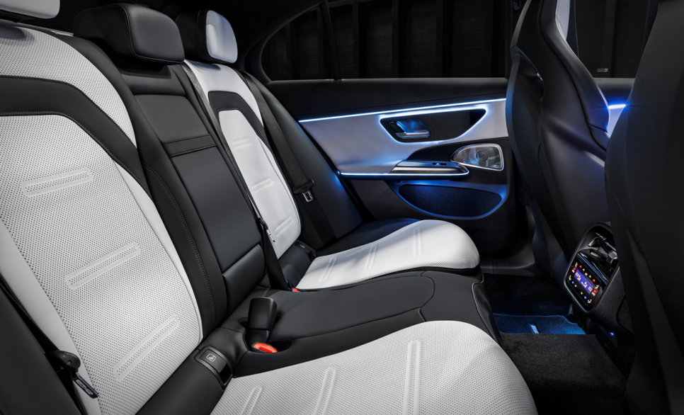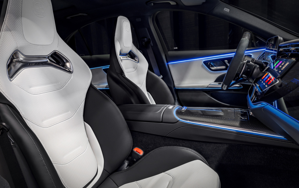 AMG 드라이브 유닛 버튼 포함된 3-스포크 D 컷 퍼포먼스 스티어링 휠과 12.3인치 디지털 계기판 그리고 14.4인치 MUBX 인포테이먼트 시스템 및 MBUX 슈퍼 스크린(옵션)까지 현대적인 구성에 더해 1열을 감싸는듯한 은은한 분위기의 액티브 앰비언트 라이트와 나파 룩 아티코 대시보드는 고급스럽고 화려한 분위기를 완성시켜줍니다. 도어 패널, 센터콘솔 등 실내 마감 품질은 고급스럽게 잘 되어 있죠.