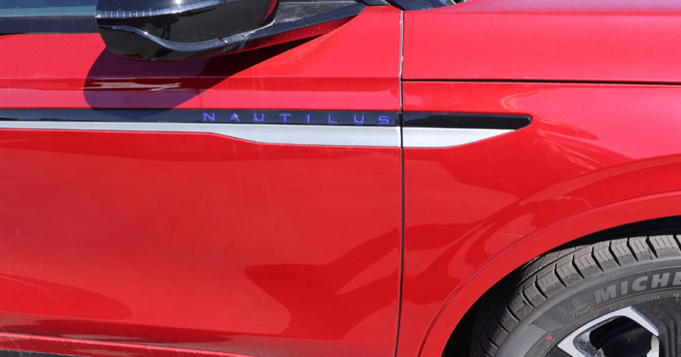 전장 4,910mm, 전폭 1,950mm, 전고 1,735mm, 축거 2,900mm 크기의 중형 SUV 차량인데요 거의 준대형 SUV 수준으로 꽤 크다고 보시면 됩니다. 실제 거주성에 대한 호평도 매우 높은 편입니다. 측면을 보면 길게 뻗은 루프 라인 디자인이지만, 리어 쪽으로 완만하게 떨어지면서 쿠페 느낌도 살짝 있죠. 노틸러스 레터링이 들어간 프론트 휀더 가니쉬, 역동적인 웨이스트 라인, 20~22인치 휠 탑재까지 군더더기 없이 깔끔합니다.