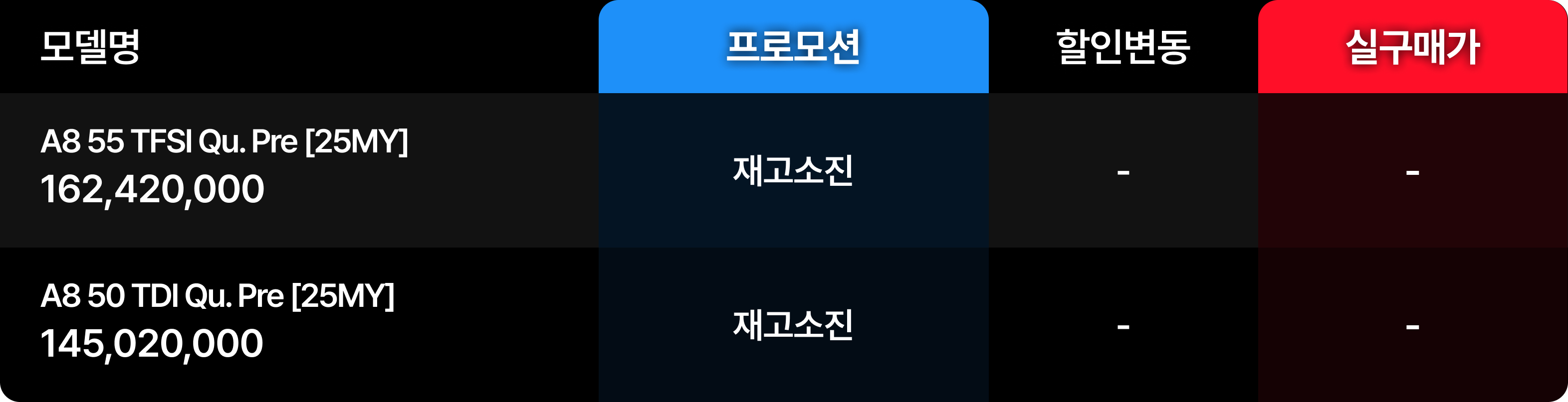 이번 달 프로모션 데이터에서 가장 눈에 띄는 부분은 프리미엄 라인업의 부재이다. 독보적인 디자인으로 극찬을 받았던 아우디 A7 라인업은 55 TFSI 50 TDI 플러그인 하이브리드 모델까지 전량 단종 처리되었다. 제조사의 라인업 효율화 전략의 일환으로 분석된다.