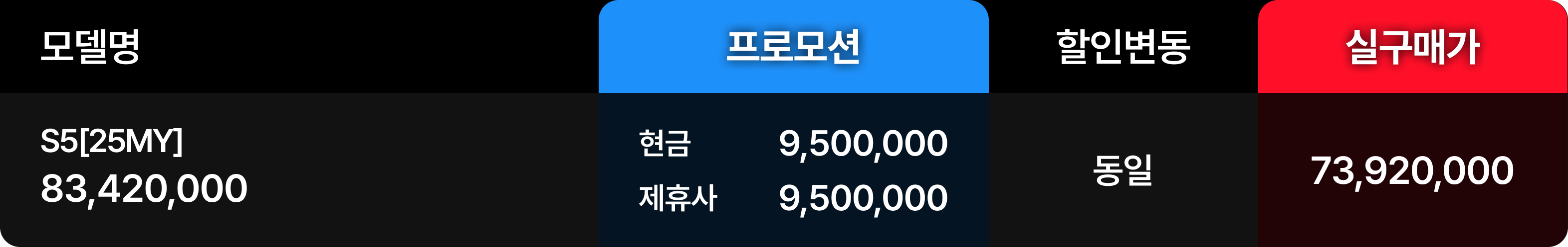 아우디 S5 모델에도 950만 원의 프로모션이 일괄 적용되어 기존 8,342만 원의 가격이 7,392만 원으로 조정되었다. 고성능 세그먼트에서 이 정도의 할인 폭은 경쟁 모델 대비 뛰어난 가격 경쟁력을 확보하는 핵심 요소라 판단한다.