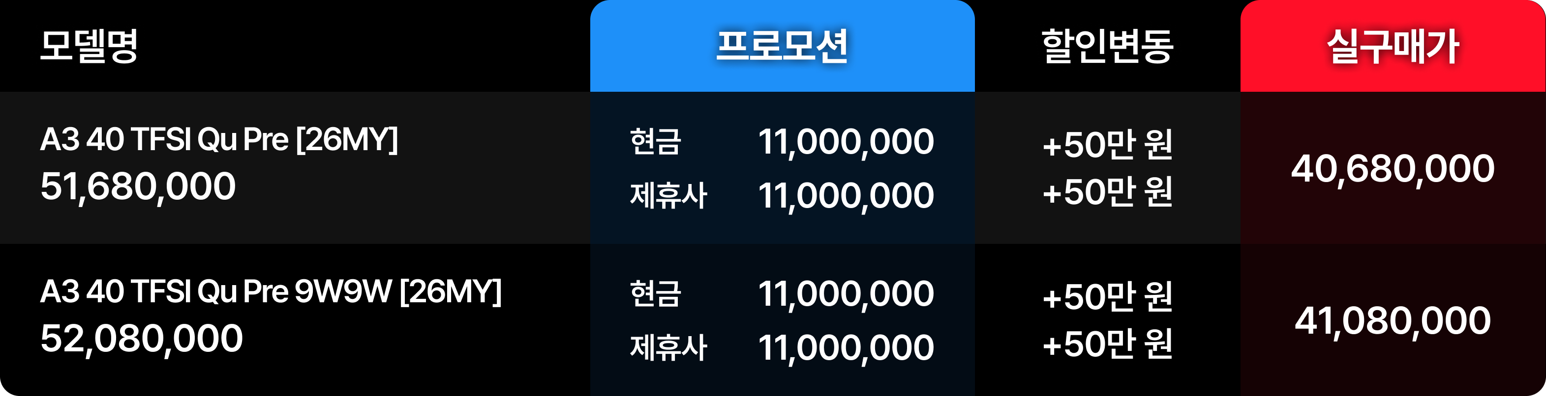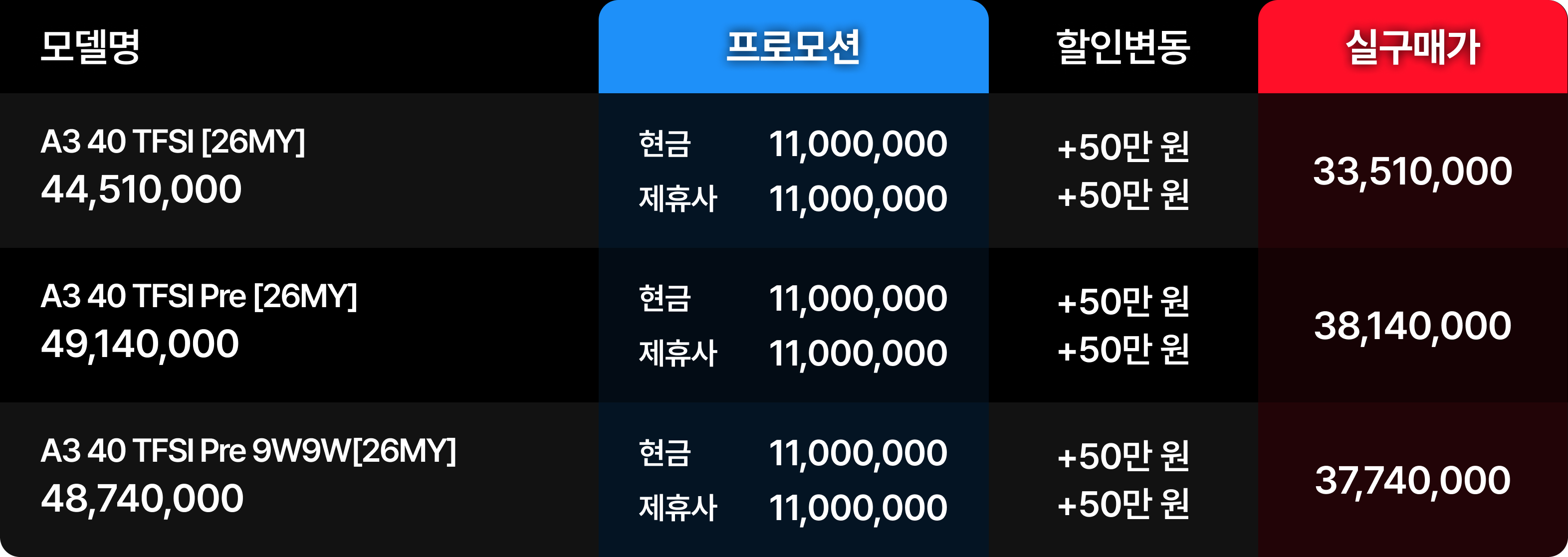 아우디 A3 40 TFSI 1,100만 원 프로모션 적용을 통해 3,000만 원대 진입하며 타깃층 확대