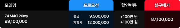 Z4 sDrive 20i M 스포츠는 연식에 따라 6천만 원대 중후반 실구매가 구간에 형성돼 있고, Z4 M40i 26my는 8,710만 원 수준으로 제시됐습니다. 특히 Z4 M40i는 직렬 6기통 기반의 강한 주행 감성과 BMW 특유의 밸런스를 모두 담고 있는 모델이라, 단순히 예쁜 오픈카를 넘어 제대로 된 드라이빙 감성을 원하는 소비자에게도 의미가 있습니다.