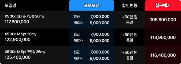 X5 30d xLine 7인승은 실구매가 1억 880만 원, X5 xDrive40i xLine 7인승은 1억 1,380만 원, 플러그인 하이브리드인 X5 xDrive50e xLine은 1억 2,040만 원 수준입니다. X6 xDrive30d M 스포츠는 1억 1,450만 원, X6 xDrive40i M 스포츠는 1억 2,510만 원으로 제시됐습니다.