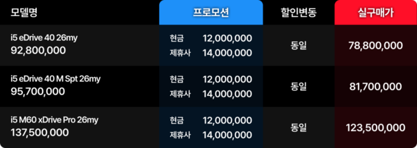 이어 i5 eDrive40은 7,880만 원, i5 eDrive40 M 스포츠는 8,170만 원, i5 M60 xDrive 프로는 1억 2,350만 원으로 형성됐고, 플래그십 전기 세단 i7 eDrive50 M 스포츠 리미티드는 1억 4,210만 원, i7 eDrive50 M 스포츠는 1억 5,410만 원, i7 eDrive60 M 스포츠는 1억 8,410만 원입니다.