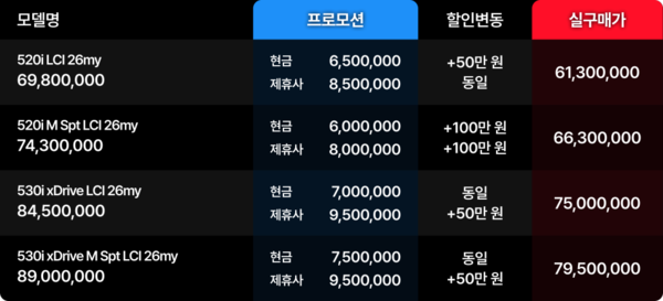 이번 프로모션의 핵심은 특정 모델 몇 대만 내세운 단기 이벤트가 아니라는 점입니다. 엔트리 모델부터 볼륨 세단, SUV, 전기차, 고성능 M까지 할인 범위가 넓고, 기본 혜택 외에도 재구매와 가족 구매, 트레이드인 조건이 더해지면서 실제 체감 가격이 달라지는 구조를 만들었습니다.