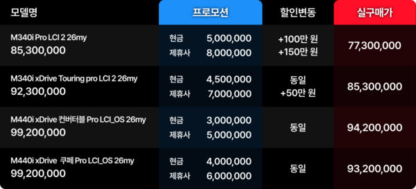 정통 M으로 올라가면 숫자는 더 강해집니다. M2 쿠페 26my는 실구매가 8,370만 원, M3 컴피티션 M xDrive는 1억 2,360만 원, M3 컴피티션 투어링 M xDrive는 1억 2,420만 원, M4 컴피티션 M xDrive는 1억 3,460만 원, M4 컴피티션 M xDrive 컨버터블은 1억 2,880만 원, 신형 M5 26my는 1억 5,860만 원 수준입니다.