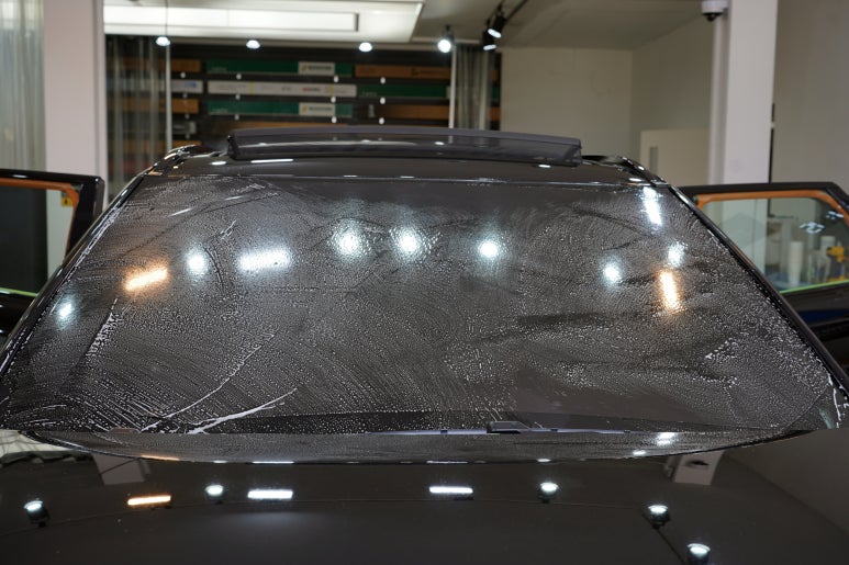 전면 유리 역시 안쪽에 대형 타월로 스팀존을 만들어 기존 필름을 깨끗하게 떼어냈습니다.
