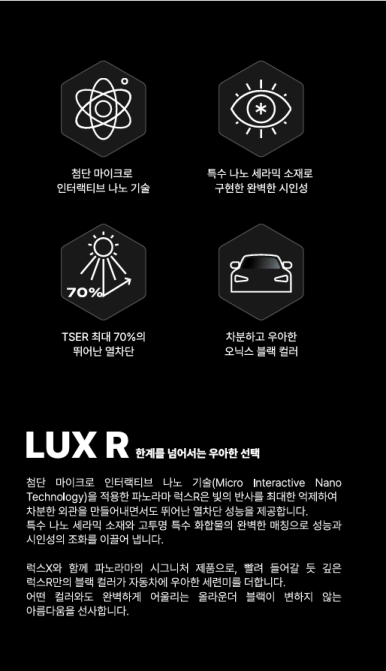 반사가 없는 은은한 블랙 컬러가 주는 차분함이 차량의 도장면과 더 잘 어우러질 것이라 판단하여 최종적으로 럭스 R을 선택했습니다.